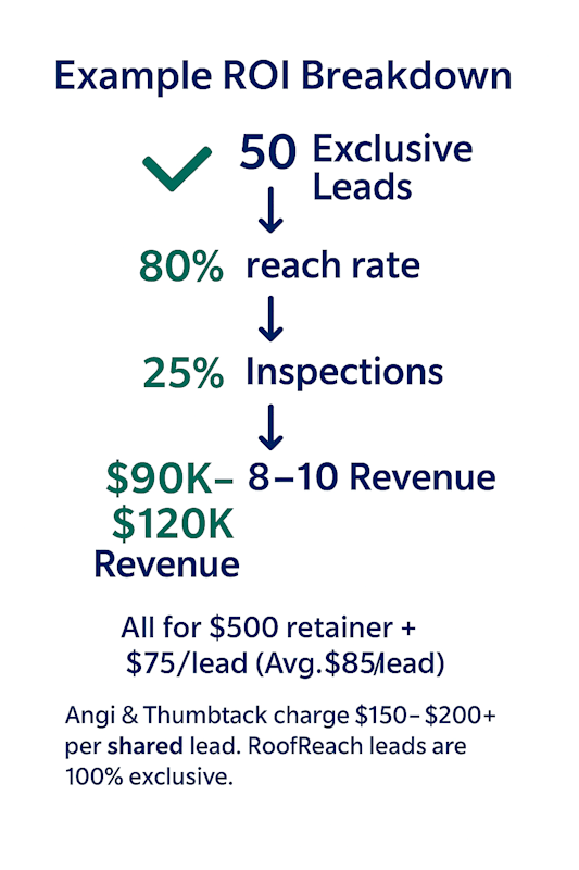 When you reserve your spot in a city, every lead we send is 100% exclusive — never shared, never resold. Each homeowner is connected directly to you, giving you a major edge in trust, response rate, and closed jobs — with zero bidding wars like Angi or HomeAdvisor. Just 50 exclusive RoofReach leads can generate $90K–$120K in roofing revenue, all for a simple $500 monthly retainer plus $75 per lead. That’s how you grow your local market — one exclusive lead at a time.